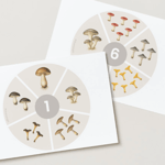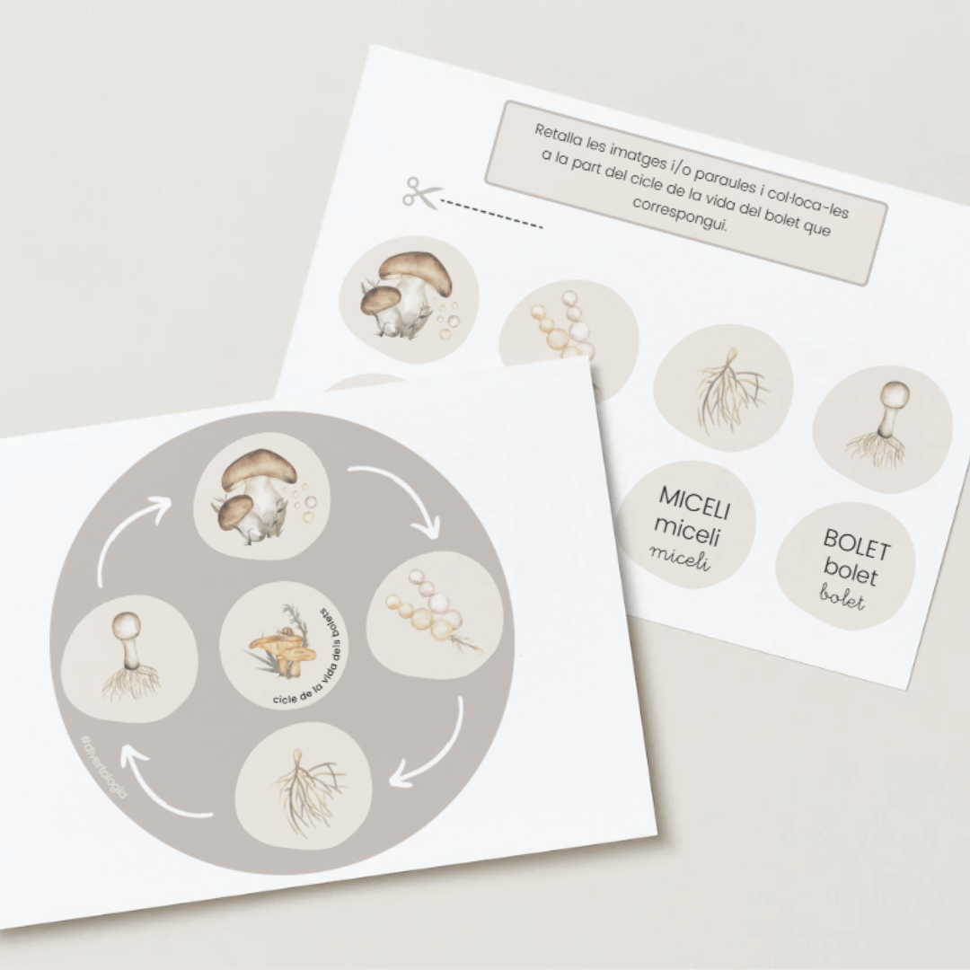 🌿 Cicle de la vida dels bolets: roda il·lustrada i targetes amb imatges.