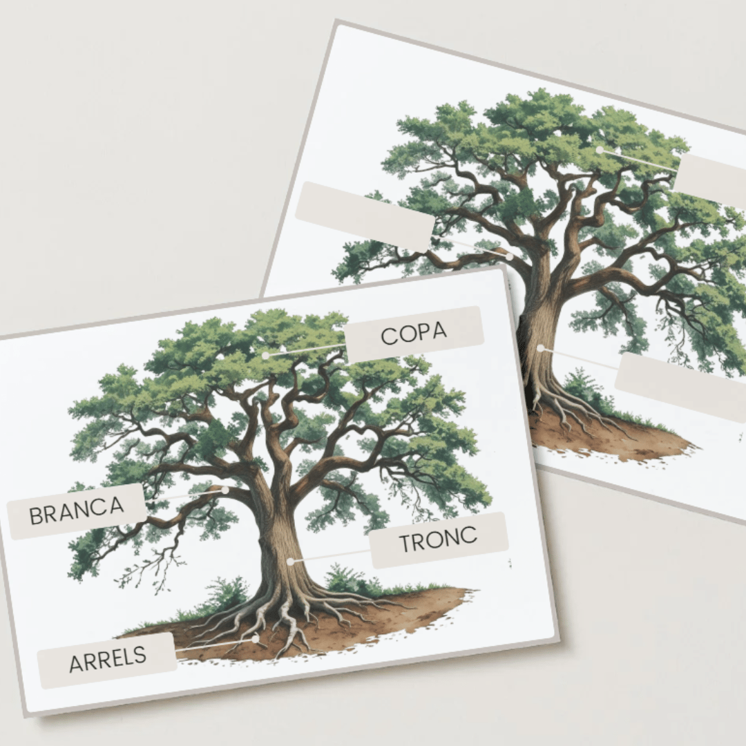 🌿 Activitats per identificar les parts de l'arbre, les parts de la fulla, rodes per descobrir les escorces dels arbres i els colors de les fulles, propostes per comptar els anells dels troncs...