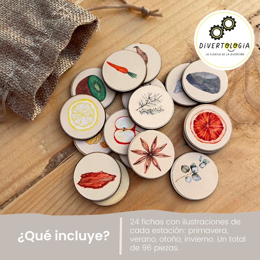 - Fichas del vocabulario de las 4 estaciones. 24 piezas ilustradas inspiradas en otoño, invierno, primavera y verano. Un total de 96 piezas.